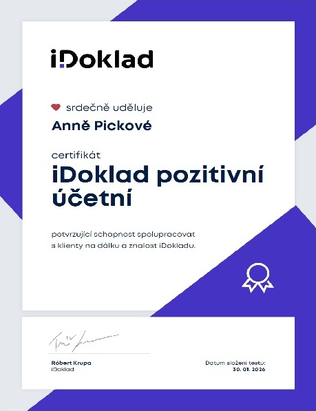 Jsem držitelkou certifikátu iDoklad pozitivní účetní, který potvrzuje odbornou znalost systému a schopnost poskytovat online spolupráci.